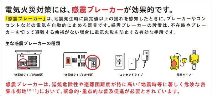 現在、この火災と類焼を防ぐために、内閣府・消防庁・経済産業省が一体となり、「感震ブレーカー」の普及設置を推進しています。